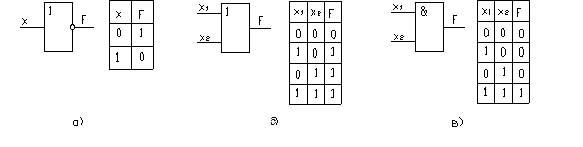 Рис.22. Условное обозначение и таблицы истинности простейших логических элементов: а) НЕ; б) ИЛИ; в) И