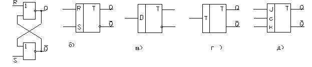 Рис.24.Условные графические обозначения триггеров: а) RS-триггер на основе логических элементов ИЛИ-НЕ; в виде отдельных микросхем: б) RS-триггер; в)D-триггер; г) T-триггер; д) JK-триггер