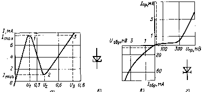 Рис. 2.7. Вольт-амперная характеристика туннельного диода (в) и его условное обозначение (б); вольт-амперная характеристика обращенного диода (в) и его условное обозначение (г)