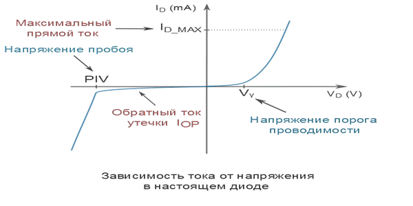 Vϒ(гамма) - напряжение порога проводимости При прямом включении напряжение на диоде должно достигнуть определенного порогового значения - Vϒ. Это напряжение, при котором PN-переход в полупроводнике открывается достаточно, чтобы диод начал хорошо проводить ток. До того как напряжение между анодом и катодом достигнет этого значения, диод является очень плохим проводником. Vϒ у кремниевых приборов примерно 0.7V, у германиевых – около 0.3V. ID_MAX - максимальный ток через диод при прямом включении При прямом включении полупроводниковый диод способен выдержать ограниченную силу токаID_MAX. Когда ток через прибор превышает этот предел, диод перегревается. В результате разрушается кристаллическая структура полупроводника, и прибор становится непригодным. Величина данной силы тока сильно колеблется в зависимости от разных типов диодов и их производителей. IOP – обратный ток утечки При обратном включении диод не является абсолютным изолятором и имеет конечное сопротивление, хоть и очень высокое. Это служит причиной образования тока утечки или обратного тока IOP. Ток утечки у германиевых приборов достигает до 200 µА, у кремниевых до нескольких десятков nА. Самые последние высококачественные кремниевые диоды с предельно низким обратным током имеют этот показатель около 0.5 nA. PIV(Peak Inverse Voltage) - Напряжение пробоя При обратном включении диод способен выдерживать ограниченное напряжение – напряжение пробоя PIV. Если внешняя разность потенциалов превышает это значение, диод резко понижает свое сопротивление и превращается в проводник. Такой эффект нежелательный, так как диод должен быть хорошим проводником только при прямом включении. Величина напряжения пробоя колеблется в зависимости от разных типов диодов и их производителей. Основные параметры. По назначению полупроводниковые диоды подразделяются на выпрямительные диоды малой, средней и большой мощности, импульсные диоды и полупроводниковые стабилитроны. Выпрямительные диоды малой мощности. К ним относятся диоды, поставляемые промышленностью на прямой ток до 300мА. Справочным параметром выпрямительных диодов малой мощности является допустимый выпрямительный ток (допустимой среднее значение прямого тока), который определяет в заданном диапазоне температур допустимое среднее за период значение длительно протекающих через диод импульсов прямого тока синусоидальной формы при паузах в 180 (полупериод) и частоте 50 Гц. Максимальное обратное напряжения этих диодов лежит в диапазоне от десятков до 1200В. Выпрямительные диоды средней мощности. К этому типу относятся диоды, допустимое среднее значение прямого тока которых лежит в пределах 300мА-10мА. Большой прямой ток этих по сравнению с маломощными диодами достигается увеличением размеров кристалла, в частности рабочей площади p-n перехода. Диоды средней мощности выпускаются преимущественно кремниевыми. В связи с этим обратный ток этих диодов при сравнительно большой плоскости p-n перехода достаточно мал(несколько десятков микроампер). Теплота, выделяемая в кристалле от протекания прямого и обратного токов в диодах средней мощности, уже не может быть рассеяна корпусом прибора. Мощные (силовые) диоды. К данному типа относятся диоды на токи от 10А и выше. Промышленность выпускает силовые диоды на токи 100 - 100 000 А и обратные напряжения до 6000 В. Силов
