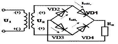 Рисунок 79 – Схема однофазного мостового выпрямителя Сравним достоинства двухполупериодных однофазных схем выпрямления. Однофазная нулевая схема: 1) Число вентилей в 2 раза меньше, чем в однофазной мостовой. 2) Потери мощности в выпрямителе будут меньше, так как в нулевой схеме ток проходит через один вентиль, а в мостовой - последовательно через два. Однофазная мостовая схема: 1) Амплитуда обратного напряжения на вентилях в 2 раза меньше, чем в нулевой схеме. 2) Вдвое меньше напряжение (число витков) вторичной обмотки трансформатора при одинаковых значениях напряжения Ud 3) Трансформатор имеет обычное исполнение, так как нет вывода средней точки на вторичной обмотке. 4) Расчетная мощность трансформатора на 25% меньше, чем в нулевой схеме, следовательно, меньше расходуется меди и железа, меньше будут размеры и масса. Данная схема выпрямителя может работать и без трансформатора, если напряжение сети U1 подходит по значению для получения необходимого напряжения Udи не требуется изоляции цепи выпрямленного тока от питающей сети.
