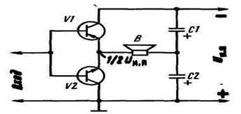 Сущность работы двухтактного усилителя заключается в следующем. Колебания звуковой частоты (графика на рис. 6) с предоконечного каскада подаются на базы обоих транзисторов так, что напряжения на них изменяются в любой момент времени в противоположных направлениях, т.е. в противофазе. При этом транзисторы работают поочередно, на два такта за каждый период подводимого к ним напряжения. Когда, например, на базе транзистора V1 отрицательная полуволна, он открывается и через секцию Iа первичной обмотки выходного трансформатора идет ток только этого транзистора (график б). В это время транзистор V2 закрыт, так как на его, базе положительная полуволна напряжения. В следующий полупериод, наоборот, положительная полуволна будет на базе транзистора V1, а отрицательная - на базе транзистора V2. Теперь открывается транзистор V2 и через секцию Iб первичной обмотки выходного трансформатора идет ток его коллектора (график в), а транзистор V1, закрываясь, «отдыхает». И так при каждом периоде звуковых колебаний, подводимых к усилителю. В обмотке трансформатора коллекторные токи обоих транзисторов суммируются (график г), в результате на выходе усилителя получаются более мощные электрические колебания звуковой частоты, чем в обычном однотактном усилителе. Динамическая головка В, подключенная ко вторичной обмотке трансформатора, преобразует их в звук. Теперь, пользуясь схемой на (рис. 7), разберемся в принципе работы бестрансформаторного двухтактного усилителя мощности. Здесь также два транзистора, но они разной структуры: транзистор Vl - p - n - p, транзистор V2 - n - p - n. По постоянному току транзисторы включены последовательно, образуя как бы делитель напряжения питающего их источника постоянного тока. При этом на коллекторе транзистора V1 относительно средней точки между ними, называемой точкой симметрии, создается отрицательное напряжение, равное половине напряжения источника питания, а на коллекторе транзистора V2 - положительное, и также равное половине напряжения источника питания Uн.п. Динамическая головка В включена в эмиттерные цепи транзисторов: для транзистора V1 - через конденсатор С2, для транзистора V2 - через конденсатор С1. Таким образом, транзисторы по переменному току включены по схеме ОК (эмиттерными повторителями) и работают на одну общую нагрузку - головку В.