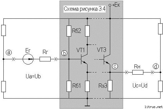 Рисунок 5.2. Мостовая схема включения источника сигнала и нагрузки в УПТ Для расчета частотных и временных характеристик УПТ с прямым усилением можно использовать материалы подразделов 2.5 и 3.3, а также подраздела 2.9 в случае построения УПТ на ПТ. Для целей согласования потенциалов используют транзисторы различной проводимости, для лучшей температурной компенсации применяют диоды и стабилитроны. Применение двухполярного источника питания позволяет непосредственно подключать источник сигнала и нагрузку к УПТ, т.к. в этом случае обеспечены нулевые потенциалы на его входе и выходе. Указанные меры реализованы в схеме УПТ, приведенной на рисунке 5.3. УПТ с прямым усилением на основе непосредственной связи между каскадами и глубокими ООС позволяют получить K0≤40 дБ приUвх порядка десятков милливольт. В таких УПТ возникает проблема устранения паразитной ОС по цепям питания, ибо не представляется возможным применение обычных фильтров. УПТ прямого усиления имеют большой температурный дрейф (eдр составляет единицы милливольт на градус). Кроме температурного дрейфа в таких УПТ существенное влияние оказывают временной дрейф, нестабильность источников питания и низкочастотные шумы. Отмеченные недостатки в значительной мере преодолеваются в УПТ с преобразованием (модуляцией) сигнала. На рисунке 5.4 приведена структурная схема УПТ с преобразованием постоянного тока в переменный и даны эпюры напряжений, поясняющие принцип его работы. Входной сигнал постоянного напряжения Uвх преобразуется в пропорциональный ему сигнал переменного напряжения с помощью модулятора М, потом усиливается обычным усилителем гармонических сигналов У, а затем демодулятором ДМ преобразуется в сигнал постоянного напряжения Uн. Поскольку в усилителях переменного тока дрейф нуля не передается от каскада к каскаду (из-за наличия разделительных емкостей между каскадами), то в данном УПТ реализуется минимальный дрейф нуля. В качестве модулятора можно использовать управляемые ключевые схемы, выполненные обычно на ПТ. Простейшим демодулятором является обычный двухполупериодный выпрямитель с фильтром на выходе. Следует заметить, что существует большое многообразие схемных решений как модуляторов, так и демодуляторов, рассмотрение которых не позволяет ограниченный объем данного пособия. В качестве недостатков УПТ с преобразованием сигнала следует отнести проблему реализации модуляторов малого уровня входного сигнала и повышенную сложность схемы. Достичь существенного улучшения электрических, эксплуатационных и массогабаритных показателей УПТ можно за счет их построения на основе балансных схем.