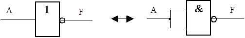 Логика называется положительной, если высокий потенциал отображает единицу, а низкий, – ноль. Если наоборот, высокий потенциал отображает ноль, а низкий, – единицу, то логика называется отрицательной. Данное правило называют логическим соглашением. Самым важным следствием применения отрицательной логики является то, что при переходе от положительной логики к отрицательной функция И превращается в ИЛИ, и наоборот. Это можно проиллюстрировать следующим образом: – в положительной логике: в комнате зимой Т епло, если батареи отопления В ключены И окна З акрыты (Т = ВЗ); – в отрицательной логике: в комнате зимой НЕ Т епло, если батареи отопления НЕ В ключены ИЛИ окна НЕ З акрыты (` Т = ` В + ` З). Здесь И переходит в ИЛИ когда входные аргументы и вывод отрицаются, при этом смысл выражения практически не меняется. Благодаря этому переходу от И к ИЛИ и удается с помощью однотипных элементов инвертирующего базиса получать все остальные логические функции. Об этом говорят два постулата де 'Моргана: