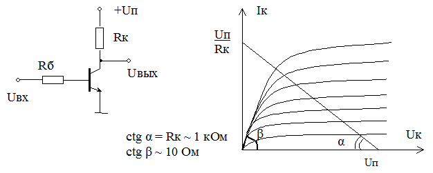 Инвертирующий усилитель на транзисторе включен по схеме с общим эмиттером и кроме усиления сигнала реализует логическую функцию НЕ. Ток базы Iб.гр. для данного Uпит и данного Rк определяет границу между областью активного (усилительного) режима и областью насыщения транзистора. Чем больше базовый ток по отношению к Iб.гр., то есть больше степень насыщения транзистора, тем больше потребуется времени для рассасывания заряда в базе транзистора после его закрывания. Обеспечить выходное напряжение логического нуля достаточно низким, чтобы иметь какой–то запас от помех можно, если режим транзистора при логическом нуле на выходе устанавливать в области насыщения или вблизи ее. Транзисторы при изготовлении имеют большой разброс по усилению: в 3…5 раз. Выбирая номинал базового резистора Rб таким, чтобы при подаче на вход инвертора заданного U1вх.min даже транзисторы с минимальным усилением находились в области насыщения или вблизи ее, все остальные транзисторы с неминимальным усилением вводить в режим глубокого насыщения.