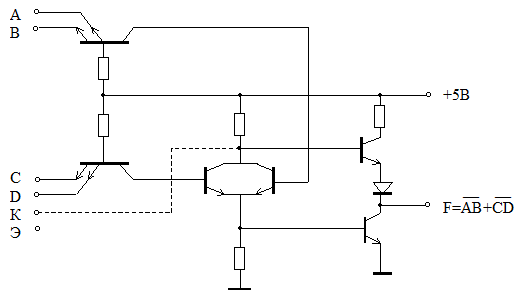 Рис.7.2.1. Микросхема 2И–2ИЛИ–НЕ с выводами коллектора и эмиттера фазоразделительного каскада, предназначенными для подключения расширителей по ИЛИ.