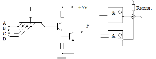 Рис.7.3.1. Схема логического элемента с выходом с открытым коллектором (ОК) и способ параллельного подключения двух таких выходов к одной линии.