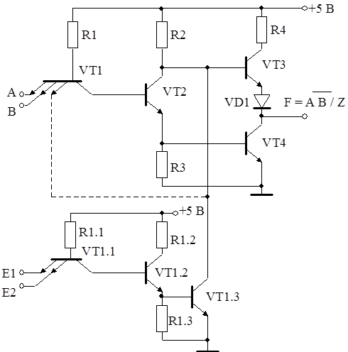 Здесь входы Е1 и Е2 (иногда такие входы обозначают двумя буквами EO – сокращенное ENABLE OUTPUT – разрешение выхода) управляют в соответствии с таблицей истинности состоянием выходного каскада. В этой микросхеме два логических элемента: верхний, управляемый, и нижний, управляющий, транзисторы которого имеют обозначение, содержащее две цифры, разделенные точкой. Если на один из входов Е1 или Е2 (или на оба входа) подана логическая единица, то в нижнем управляющем логическом элементе транзистор VT1.1 закрыт, VT1.2 открыт и VT1.3 открыт, следовательно, в верхнем логическом элементе напряжение на коллекторе VT2 близко к нулю, а тогда и напряжение на его эмиттере близко к нулю, значит, будут закрыты оба выходных транзистора VT3 и VT4. Входы управления Z–состоянием EO следует отличать от входов EI (сокращенное ENABLE INPUT – разрешение входа, когда схема, аналогичная собранной на транзисторах T1.1, T1.2 и T1.3 управляет по пунктирной линии одним из эмиттеров входного многоэмиттерного транзистора основного логического элемента, обеспечивая непрохождение сигналов A и B, отключая входы). При управлении по входам типа EI на выходе F будет состояние логического нуля, а не Z–состояние, как при управлении по входам типа EO.