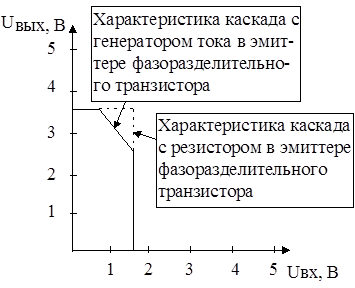 Здесь пунктиром показана характеристика логического элемента с генератором тока вместо эмиттерного сопротивления фазоразделительного каскада, а сплошной линией, – характеристика логического элемента с обычным резистором в эмиттере фазоразделительного транзистора. Из этой характеристики следует, что генератор тока вместо эмиттерного сопротивления в фазоразделительном каскаде не только повышает быстродействие логического элемента за счет более быстрого рассасывания накопленных зарядов в области базы нижнего транзистора выходного двухтактного каскада при закрывании этого транзистора, но и улучшает передаточную характеристику ТТЛ логического элемента.