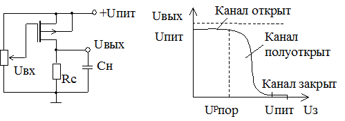 Рис. 8.1.2. Схема включения р –МОП транзистора и передаточная характеристика такого каскада