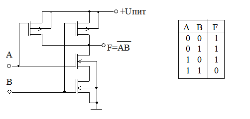 Рис 8.3.1. Схема КМОП логического элемента И–НЕ и его таблица истинности