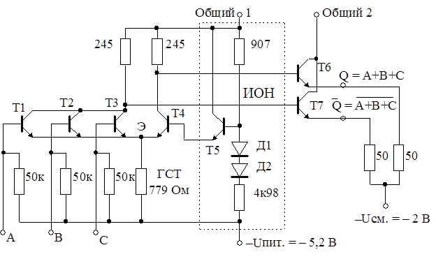 Рис.9.2. Схема трехвходового логического элемента ЭСЛ серии К500