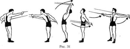 Резину длиной 4-6 м сложить вдвое и середину ее закрепить на гимнастической стенке (у столба, дерева) на уровне пояса. Концы резины взять в руки. 1. Стоя лицом к стенке, ноги врозь, одна нога впереди другой, руки впереди, резину натянуть: сгибание и разгибание рук, отведение назад, в стороны, вниз-назад, вверх-назад, круговые движения руками (рис. 38). 2. Стоя спиной к стенке на расстоянии натянутой резины, руки согнуты, кисти около груди: разгибание и сгибание рук (рис. 39). 3. Стоя, руки в стороны: сведение рук вперед и разведение, руки вверх, вниз. 4. Стоя, руки за голову: локти вперед. Выпрямление рук вверх-вперед. 5. Встать на середину резины, натянув ее согнутыми руками: разгибание рук вверх (жим) и сгибание; руки в стороны, сведение прямых рук над головой и разведение в исходное положение (рис. 40). 6. Стоя, руки за голову, локти вперед-вверх: разгибание и сгибание рук. 7. Стоя, руки согнуты к плечам, резина за спиной: сгибание-и разгибание рук (рис. 41). Все упражнения выполняются одновременно двумя руками и попеременно.