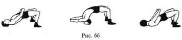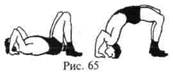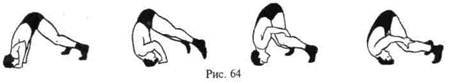 1. Стоя, движения головой вперед-назад, влево-вправо, круговые. То же с сопротивлением руками. 2. Стоя, ноги врозь с упором головой в ковер. Движения головой вперед-назад, влево-вправо, круговые с помощью рук (упираются в ковер) и без помощи (рис. 64). 3. Стоя на голове, опираясь ногами о стену. Движения головой вперед-назад, влево-вправо, круговые с помощью и без помощи рук. 4. Из положения лежа на спине «мост» с помощью и без помощи рук (рис. 65) и уходы с моста забеганием, переворотом. 5. Стоя на мосту, движения туловищем вперед-назад, с поворотом головы влево и вправо, с помощью и без помощи рук (рис. 66). 6. Из положения стоя «мост» с одновременным касанием ковра предплечьями и лбом. 7. Перевороты с «моста» через голову, держась руками за край ковра (за гриф штанги, гирю) или упираясь ладонями, предплечьями; рывком прямыми руками вперед за голову, с согнутыми ногами с прямыми ногами прогнувшись (рис. 67). 8. Переворот со стойки через «мост», соединив руки в крючок (см. рис. 67).