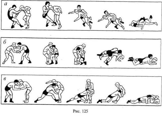 К базовым приемам в стойке относятся: перевод рывком за руку с подсечкой (рис. 125, а), перевод нырком захватом руки и бедра (рис. 125, б), сваливания сбиванием захватом разноименной ноги с переходом захватом двух ног (рис. 125, в). Описание приемов выполняется в следующем порядке: начало атаки, захват, подведение собственной опоры к общему центру массы, отрыв, полет и опрокидывание (приземление).