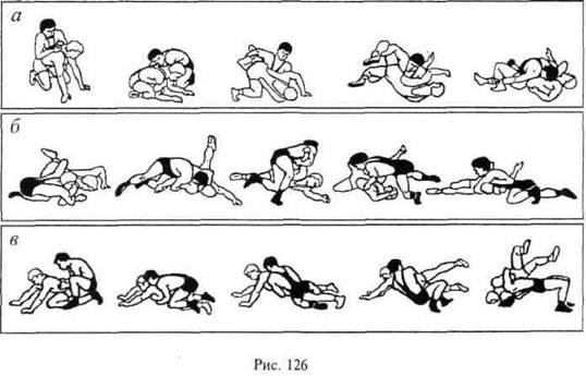К базовым приемам в партере относятся: переворот скручиванием захватом дальней руки и ближней голени (рис. 126, в), переворот забеганием захватом руки на «ключ» (рис. 126, б), переворот накатом захватом туловища (рис. 126, в).