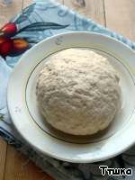 | Начать замешивать тесто - вначале лопаткой (или как вам удобно), затем руками. Когда тесто соберется и перестанет липнуть к рукам, перенести его на присыпанную мукой поверхность и продолжать энергично вымешивать еще минут семь до гладкости и эластичности. Клубочек теста положить в миску, припыленную мукой, накрыть влажным полотенцем и оставить подходить примерно на час или пока объем не увеличится вдвое.