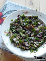 | На разогретой с растительным маслом сковороде обжарить до прозрачности лук, затем добавить грибы и тушить около 15 минут. Остудить, смешать с мелко нарезанной зеленью.