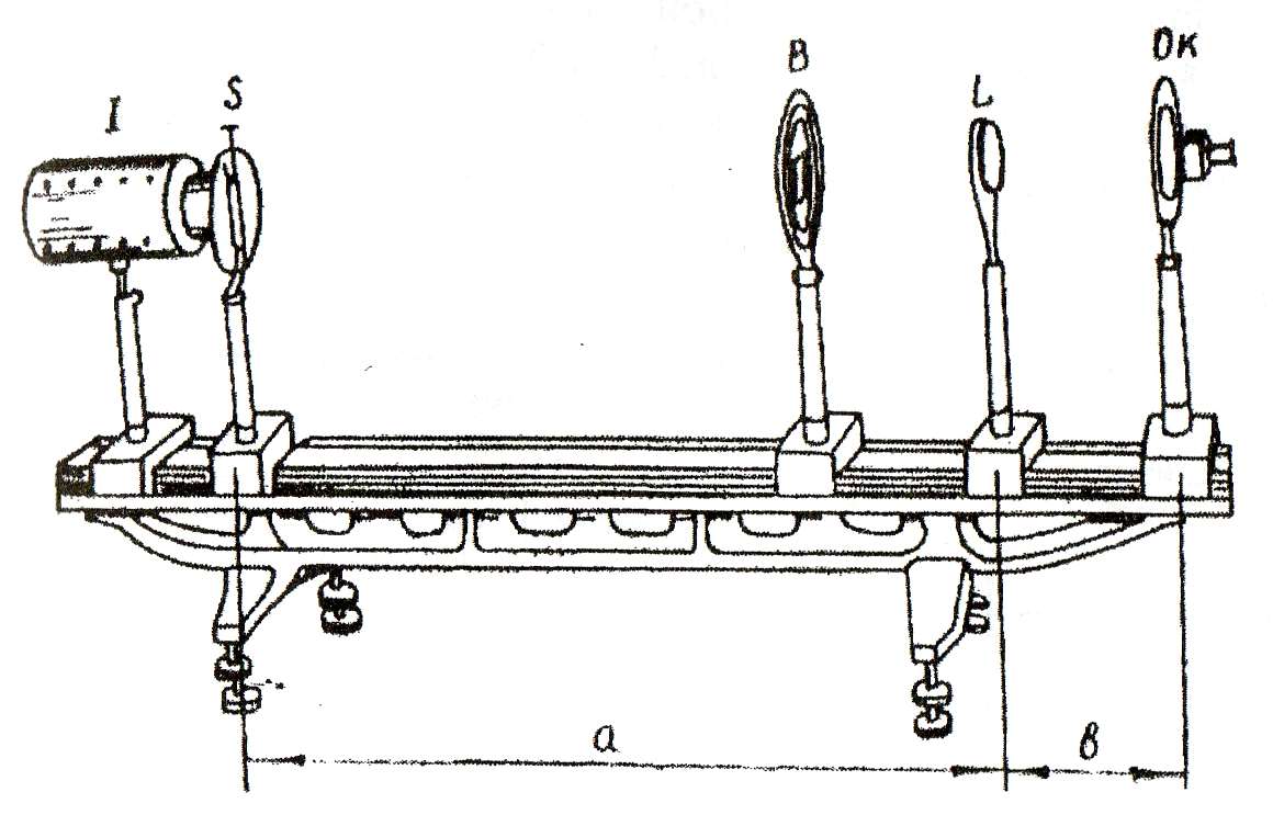 Измеряют расстояние a от щели S до линзы L, расстояние b от линзы до плоскости нитей винтового окуляр-микрометра и расстояние d0 от щели S до плоскости нитей Ок, пользуясь шкалой оптической скамьи. Для определения значений b и d0 измеряют расстояние до указателя, установленного на держателе Ок и прибавляют 40 мм (расстояние от указателя до плоскости нитей винтового окуляр-микрометра). По формуле 2 находят значение λ.