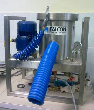 Концентратор «Фэлкон» имеет свои принципиальные особенности: конический ротор без кольцевых перегородок, футерованный износостойкой резиной; высокое (3000 м/с2) центробежное ускорение; отсутствие разрыхляющих элементов. Максимальная крупность исходного – до 2 мм. Плотность питания – до 45 % содержания твердого по массе. При этих параметрах концентрации следует ожидать более глубокого обогащения тяжелых минералов и сравнительно низкого качества концентрата. Высокого извлечения тяжелых фракций можно достигать в ущерб качеству тяжелого продукта путем увеличения частоты сполоска, т.к. отсутствие разрыхляющих средств приводит к быстрому заиливанию постели.