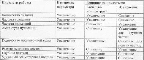 Концентратор «Kelsey». Взаимодействие факторов, влияющих на процесс отсадки: 1. Скорость вращения машины 2. Засорение решета 3. Гранулометрический состав питания 4. Качество руды 5. Плотность пульпы питания 6. Частота вращения 7. Частота пульсации 8. Таблица 1 – Влияние различных факторов на технологические показатели работы отсадочной машины.