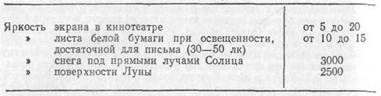 Приведем значения яркости освещенных поверхностей (табл. 3), с которыми часто приходится встречаться в жизни Таблица 3. Яркость некоторых освещенных поверхностей (в кд/м2)