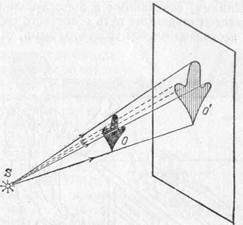 Рис. 172. При освещении точечным источником света S плоского объекта О, параллельного экрану, на экране появляется резкая тень O', подобная этому объекту