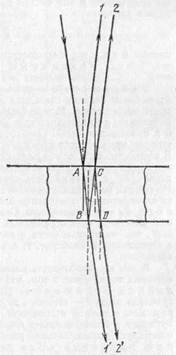 Рис. 268. Ход отраженных и проходящих лучей при двукратном отражении в пленке ке, причем для наглядности лучи изображены не вполне перпендикулярными к ней. В отраженном свете имеем луч 1, отраженный от верхней поверхности пластинки и луч 2, отраженный от нижней поверхности. В проходящем — луч 1 ', прямо прошедший через пластинку и луч 2', отразившийся по одному разу от нижней и от верхней поверхностей *). Рассмотрим сначала проходящие лучи. Лучи 1 ' и 2' обладают разностью хода, так как первый прошел через нашу пленку один раз, а второй — три раза. Образовавшаяся разность хода при нормальном падении света есть AB+BC+CD — АВ=ВС+CD=2h, где h — толщина пластинки. Если эта разность хода равна целому числу волн, т. е. четному числу полуволн, то лучи усиливают друг друга; если же разность хода равна нечетному числу полуволн, то лучи взаимно ослабляются. Итак, максимумы и минимумы получаются в тех местах пластинки, толщина которых h удовлетворяет условию