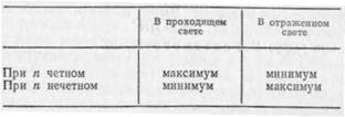 причем (m —1) обозначено через n. Минимумы соответствуют четным значениям n =0, 2, 4,..., максимумы соответствуют нечетным значениям n =1, 3, 5,... Сопоставим результаты, полученные для определения положения максимумов и минимумов в проходящем и отраженном свете. Положения максимумов и минимумов соответствуют толщине пленки, определяемой из условия:
