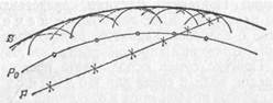 Рис. 272. К пояснению принципа Гюйгенса: Р0 — вспомогательная поверхность, совпадающая в момент t0=0 с положением фронта сферической расходящейся волны; соответствующие вторичные волны (центры — светлые кружки) изображены сплошными дугами; Р — произвольная вспомогательная поверхность; соответствующие вторичные волны (центры — крестики) изображены штриховыми дугами; S — волновая поверхность в момент t, построенная как огибающая вторичных волн принцип Гюйгенса с большой пользой применяется при разборе различных вопросов о распространении волн. Один из примеров такого применения мы найдем в следующем параграфе. § 130. Законы отражения и преломления света на основе принципа Гюйгенса. Пусть на границу раздела двух сред аb (рис. 273) падает параллельный пучок лучей, образуя