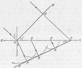 Рис. 273. К нахождению закона преломления волн. ОВ — поверхность падающей волны, ab — поверхность раздела двух сред, NC — поверхность преломленной волны угол i с перпендикуляром к поверхности раздела. Согласно закону преломления пучок преломленных лучей будет распространяться по направлению, задаваемому углом r. Закон преломления, выведенный из опыта, гласит: