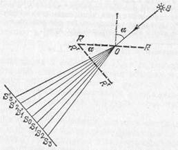 Рис. 282. Схематическое изображение дифракции при косом падения светового пучка на решетку: SO — направление первичного пучка, a — угол падения, RR — дифракционная решетка, R'R' — проекция RR на направление, перпендикулярное к первичному пучку, OS0 — направление на нулевой максимум, OS1 и OS'2 — направления на максимумы первого порядка, OS2 и OS'2 — направления на максимумы Date: 2015-05-17; view: 757; Нарушение авторских прав |