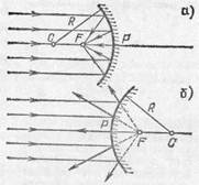 Рис. 206. Фокусы сферических зеркал: а) вогнутое зеркало; б) выпуклое зеркало. (Лучи показаны падающими на значительную часть сферических зеркал. Их следует представлять себе пересекающими зеркало на малой высоте от оси, т. е. захватывающими малую часть зеркала.) ва от полюса (рис. 206, а); в случае выпуклого зеркала фокус расположен на расстоянии R/ 2 справа от полюса, т.е. является мнимым (рис. 206, б). Пользуясь тем, что источник и его изображение находятся в сопряженных между собой точках, мы можем сразу сделать вывод, что если точечный источник света находится в фокусе зеркала, то его изображение находится в бесконечности, т. е. из зеркала выходит параллельный пучок лучей. Это условие служит основой для получения при помощи вогнутых зеркал параллельных световых пучков, точнее, пучков, близких к параллельным. О применении этого условия к устройству прожекторов мы уже говорили в гл. VIII *). Заметим, что при рассмотрении свойств сферического зеркала, как и в случае линзы, мы предполагали, во-первых, что используется очень узкий пучок лучей, прилегающих к оси зеркала, и, во-вторых, что применяется точечный источник света. Оба эти требования, конечно, вполне строго выполнены быть не могут. Вопрос о том, насколько существенны отступления от этих требований, в каждой конкретной задаче должен решаться особо.