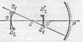 Рис. 209. Построение изображения протяженного объекта в сферическом зеркале Изображение протяженных объектов в сферическом зеркале и линзе. До сих пор мы предполагали, что источник света представляет собой светящуюся точку, находящуюся на главной оптической оси зеркала или линзы. Рассмотрим теперь изображение в сферическом зеркале или линзе небольших предметов, расположенных вблизи их главной оси. Выражение «небольшой предмет» будет означать, что данный предмет виден из центра зеркала или линзы под малым углом. Так как отдельные точки протяженного предмета лежат вне главной оптической оси, то поставленная задача сводится к построению изображения таких «внеосевых» точек. Задача эта решается без труда. Разберем ее для случая сферического зеркала. Пусть точечный источник света находится в точке S 1 на некотором расстоянии от главной оси зеркала (рис. 209). Проведем через него побочную оптическую ось. По отношению к отражению в сферическом зеркале точка S 1 вполне равноправна с точкой S, лежащей на главной оси зеркала на том же расстоянии от его центра С. Таким образом, если мы выделим узкий пучок лучей вблизи оси S 1 C, то, пользуясь результатами §91, можем утверждать, что он после отражения соберется снова в одной точке S 1 ' — изображении точки S 1. Легко видеть, что любая точка дуги S 1 SS 2 с центром в точке С изобразится точкой, лежащей на дуге S' 1 'S'S 2 ' с центром также в С. Другими словами, дуга S 1' S'S 2' является изображением дуги S 1 SS 2. Мы будем предполагать, что все точки дуги S 1 SS 2 находятся на небольшом расстоянии от главной оси. Тогда практически можно заменить дуги S 1 SS 2 и S 1' S'S 2' прямолинейными отрезками, перпендикулярными к главной оси. Итак, мы доказали, что небольшой отрезок, перпендикулярный к главной оси, изобразится после отражения в сферическом зеркале также отрезком, перпендикулярным к главной оси. Этот вывод имеет силу только при условии достаточной малости угла, под которым объект виден из центра зеркала; в противном случае заменить дугу прямолинейным отрезком нельзя. Практически нарушение этого условия приводит к тому, что изображение становится нечетким, расплывчатым по краям. Совершенно аналогично решается задача и для тонкой линзы. И в этом случае хорошее, четкое изображение протяженных объектов получается только при условии, что эти объекты (их крайние точки) видны из оптического центра линзы под малым углом к главной оси. При несоблюдении этого условия изображение получается более или менее расплывчатым и искаженным.
