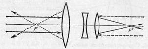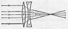 Рис. 232. Исправление сферической аберрации путем комбинирования собирающей и рассеивающей линз выравнивает различие фокусных расстояний центральных и периферических лучей, обусловленное сферической аберрацией собирающей линзы. Правильно рассчитав комбинацию собирающей и рассеивающей линз, мы можем столь полно осуществить это выравнивание, что сферическая аберрация системы из двух линз будет практически сведена к нулю (рис. 232). Обычно обе простые линзы склеиваются (рис. 233). Из сказанного видно, что уничтожение сферической аберрации осуществляется комбинацией двух частей системы, сферические аберрации которых взаимно компенсируют друг друга. Аналогичным образом мы поступаем и при исправлении других недостатков системы. Примером оптической системы с устраненной сферической аберрацией могут служить астрономические объективы. Если звезда находится на оси объектива, то ее изображение практически не искажено аберрацией, хотя диаметр объектива может достигать нескольких десятков сантиметров. § 105. Астигматизм. Эта погрешность оптических систем проявляется в тех случаях, когда желают получить изображение точки, находящейся на значительном расстоянии от главной оси системы, точнее, при использовании световых пучков, составляющих значительный угол