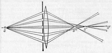 Рис. 230. Возникновение сферической аберрации. Лучи, выходящие из линзы на разной высоте над осью, дают изображения точки S в разных точках S', S", S'" Для простых отрицательных линз благодаря сферической аберрации фокусное расстояние лучей, проходящих через центральную зону линзы, также будет более значительным, чем для лучей, проходящих через периферическую зону. Другими словами, параллельный пучок, проходя через центральную зону рассеивающей линзы, становится