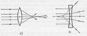 Рис. 231. Сферическая аберрация: а) в собирающей линзе; б) в рассеивающей линзе менее расходящимся, чем пучок, идущий через наружные зоны. Заставив свет после собирающей линзы пройти через рассеивающую, мы увеличим фокусное расстояние. Это увеличение будет, однако, менее значительным для центральных лучей, чем для лучей периферических (рис. 231). Таким образом, более длинное фокусное расстояние собирающей линзы, соответствующее центральным лучам, увеличится в меньшей степени, чем более короткое фокусное расстояние периферических лучей. Следовательно, рассеивающая линза благодаря своей сферической аберрации