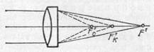 образуемые лучами разного цвета, находятся в разных точках: S' к (красное) дальше от линзы, чем S'с (синее). Если же оставить экран в том месте, где образуется резкое изображение, например синими лучами, то в красном свете мы получим на экране расплывчатое пятнышко. Вследствие этого при использовании белого света (содержащего лучи всех цветов) изображение, даваемое линзой, оказывается обычно окрашенным (окаймленным цветными кружками и т. п.). Описанное явление носит название хроматической аберрации. Эта погрешность возникает вследствие того, что показатель преломления зависит от длины волны света (дисперсия; см. § 83). Из-за этого и фокусное расстояние линзы, которое согласно формуле (88.9) зависит от показателя преломления, будет различным для лучей различного цвета. В результате изображения точки S для лучей различного цвета будут находиться на разных расстояниях от линзы. Расстояние между точками S'c и S' к зависит от сорта стекла, из которого сделана линза: оно больше для той лин- *) Частица а перед словом означает отрицание: астигматизм — неточечность изображения; ана — двойное отрицание (вместо аа) анастигматизм — неастигматизм, т. е, точечность изображения, зы, которая сделана из стекла с большей дисперсией *) (если сравниваемые линзы имеют одинаковое фокусное расстояние для лучей какого-либо цвета). Это обстоятельство используется для устранения хроматической аберрации линз следующим образом. К двояковыпуклой линзе из стекла с малой дисперсией приклеивается соответствующим образом рассчитанная рассеивающая линза из стекла с большой дисперсией (рис. 236). Добавочная линза удлиняет фокусные расстояния первой линзы (см. § 104), причем фокусное расстояние синих лучей, сильнее преломляемых, увеличивается в большей степени, чем фокусное расстояние красных лучей, слабее преломляемых. Расчет в простейшем случае ведется таким образом, чтобы фокус красных лучей F' к и фокус синих лучей F'c попали водну и ту же точку F'. Соединившись в одном месте, изображения разных цветов дадут практически белую точку, т. е. хроматическая аберрация будет устранена. Линзы с устраненной описанным способом хроматической аберрацией называются ахроматическими линзами. Применяются также системы, где соединены фокусы для трех сортов лучей,— апохроматы. Такие апохроматические системы используются, например, в микроскопии. § 107. Ограничение пучков в оптических системах. Изучая оптические системы, мы до сих пор оставляли в стороне одно важное обстоятельство — ограниченность размеров линз (или зеркал), образующих системы. Оправданием этому служило то, что для построения изображения не требуется знать реальный ход всех лучей в системе; например, для построения изображения точки достаточно построить два луча, которые, вообще говоря, могут в действительности и не проходить через прибор (см. рис. 216). Вследствие ограниченного размера любой оптической системы большая часть лучей, выходящих из светящегося объекта по всем направлениям, проходит мимо системы и не может участвовать вобразовании изображения. Всякая преграда, ограничивающая проходящие через оптическую систему лучи, называется диафрагмой. В случае простой