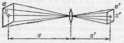 Рис. 237. К выводу формулы для освещенности изображения, даваемого линзой (d/f)2 называется светосилой линзы. Эта величина характеризует свойства линзы в отношении освещенности даваемых ею изображений. Нередко для характеристики линзы вместо светосилы (d/f)2 пользуются величиной d/f, именуемой относительным отверстием. Мы видим, что освещенность изображения уменьшается при ограничении светового пучка, вступающего в линзу. Это относится ко всякому оптическому прибору. Но в то же время качество изображения при ограничении пучка улучшается. Таким образом, хорошее качество изображения трудно сочетать с большой светосилой прибора. Практически приходится идти на некоторый компромисс и допускать некоторую потерю в светосиле для получения надлежащего качества изображения и, наоборот, мириться с ухудшением качества изображения для получения достаточной его освещенности. В современных оптических приборах удается в известных пределах сочетать большую светосилу с хорошим качеством изображения за счет использования многолинзовых оптических систем. В подобных системах аберрации, вносимые одними линзами, компенсируются аберрациями других линз. Простейшие примеры исправления оптических систем мы приводили, говоря о сферической и хроматической аберрациях и об астигматизме. Следует отметить, что расчет сложных оптических систем представляет большие трудности, требует значительного искусства и затраты длительного времени. § 109. Яркость изображения. В предыдущем параграфе мы видели, что освещенность изображения протяженного предмета повышается с увеличением диаметра линзы и с уменьшением ее фокусного расстояния. Могло бы показаться, что этим путем можно повысить также яркость изображения протяженного предмета и получить изображения, например, более яркие, чем сам источник. Однако подобное заключение оказывается ошибочным. В наилучшем случае яркость изображения может достигнуть яркости источника; это имеет место при отсутствии потерь, происходящих за счет частичного поглощения света в линзах и частичного отражения его поверхностями линз. При наличии потерь света в системе яркость изображения протяженного объекта всегда меньше яркости самого объекта. Получить яркость изображения протяженного объекта, большую чем яркость источника, нельзя никакими оптическими приборами. Невозможность увеличить яркость изображения с помощью оптической системы становится понятной, если вспомнить основное свойство всякой системы, отмеченное в § 102. Оптическая система, не имеющая потерь, не меняет светового потока, но она, уменьшая площадь изображения, во столько же раз увеличивает телесный угол, в который направляется световой поток. При уменьшении площади изображения световой поток, испускаемый единицей поверхности, увеличивается, но зато этот поток направляется в больший телесный угол. Таким образом, световой поток, испускаемый единицей поверхности в единичный телесный угол, т. е. яркость (см. §73), остается неизменным. Для простого случая образования изображения с помощью линзы мы можем подтвердить этот общий вывод путем несложного расчета. Поместим перед линзой на расстоянии а от нее небольшую светящуюся поверхность с площадью s, перпендикулярную к главной оси. Пусть ее изображение находится на расстоянии а' от линзы и имеет площад