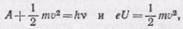 Исследование при помощи опытов, подобных описанному, установило следующие законы фотоэффекта. 1.Число электронов, освобожденных светом за единицу времени (т. е. ток насыщения), прямо пропорционально световому потоку. 2.Скорость вылетающих фотоэлектронов не зависит от освещенности, а определяется частотой света. Схема, изображенная на рис. 331, непригодна для точных измерений. При расстоянии между пластинами, большом по сравнению с их размерами, не удается перехватить все электроны, освобожденные све- *) Здесь буквой е обозначен элементарный заряд, т. е. положительный заряд, равный абсолютной величине заряда электрона. Сам заряд электрона отрицателен и равен — е. том(получить истинное значение силы тока насыщения), и затруднительно установить точное значение U, определяющее скорость фотоэлектронов. Более совершенным является предложенный П. И. Лукирским прибор,в котором электроды образуют сферический конденсатор: один электрод — небольшой шарик в центре сферы, поверхность которой образует второй электрод. Такой прибор позволяет надежно определять ток насыщения и задерживающий потенциал U, а следовательно, определять фототок и максимальную скорость вылетающих электронов. Естественно возникает вопрос, как зависят количество и скорость освобождаемых светом электронов от вещества освещенного металла. Исследование вылета электронов из нагретых металлов (см. том. II, §§89 и 90) показало, что каждому веществу соответствует своя работа выхода, т. е. каждый металл характеризуется определенной энергией, которую необходимо сообщить электрону, для того чтобы он мог преодолеть силы, удерживающие его внутри металла. К совершенно тем же выводам мы приходим, изучая испускание электронов под действием света. Для некоторых металлов удалось определить работу выхода как при помощи явления испускания электронов при нагревании, так и при помощи фотоэлектрического эффекта. Оба метода дали одни и те же значения. Так, например, для вольфрама получены следующие значения работы выхода: 7,18•10-19 Дж по фотоэлектронной эмиссии, 7,23•10-19 Дж по термоэлектронной эмиссии. Пусть из некоторого металла, для которого работа выхода равна А, под действием света частоты n вырываются электроны со скоростью v, т. е. обладающие кинетической энергией 1/2 mv 2. Таким образом, вся энергия, сообщенная каждому электрону, W=А+ 1/2 mv 2. Опыты, подобные описанным выше, показали, что полная энергия, сообщаемая электрону светом, прямо пропорциональна частоте света, т.е. W = А +1/2 mv 2 = hn, где h — постоянная величина. Эта постоянная не только не зависит от частоты света и освещенности, но сохраняет одно и то же значение для всех веществ. Поэтому h является фундаментальной постоянной. Она получила название постоянной Планка в честь немецкого физика Макса Планка. Из описанных опытов можно определить h, ибо величины A, mv 2 и n могут быть измерены. Для h получено значение 6,6•10-34 Дж•с. Пользуясь найденными соотношениями, второй закон фотоэффекта можно формулировать так: полная энергия, получаемая электроном от света частоты n, равна hn. Испуская под действием света электроны, металл должен заряжаться положительно. Вследствие этого возникает электрическое поле, затрудняющее дальнейшее испускание электронов. Какова же предельная разность потенциалов U между освещаемой пластинкой и стенами лаборатории