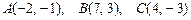 | Даны вершины треугольника : . Тогда уравнение медианы , проведённой из вершины , имеет вид: , где , ( -целые числа).