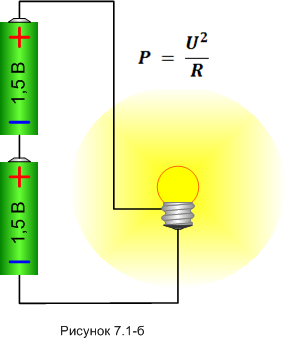 U - напряжение, которое выдаёт батарейка (в нашем примере – 1,5 Вольта); На лампочку подано напряжение от батарейки, лампочка слабенько светится. Хорошо, теперь добавим в цепь ещё одну батарейку.