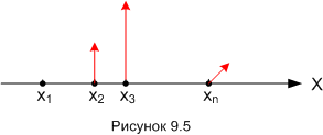 Если вы осилили предыдущие части, то некоторое представление о том, что такое квантовое состояние у вас уже имеется. Попробуем же превратить это смутное представление в чёткое понимание. Для начала уточним, что понимается под физическим состоянием в классической физике. Состояние – это некоторый набор значений физических величин, связанных с объектом. Обычно, говоря о физическом состоянии объекта, мы не рассматриваем все физические величины сразу. Например, если мы говорим о положении объекта в пространстве, то нам достаточно знать три числа, а именно, значения трёх физических величин: координат объекта X, Y, Z в заданной системе отсчёта. Во всяком случае, когда речь идёт об объекте типа «материальная точка». Или вообще нас может интересовать только одно число: значение координаты - X. Это будет «координатное представление» физического состояния. В других задачах нас может интересовать не координата, а импульс частицы (импульс, напомню, это произведение скорости объекта на его массу). Тогда мы будем рассматривать состояние объекта в «импульсном представлении». Опять же, импульс в трёхмерном пространстве – это трёхмерный вектор. Он задаётся тремя числами: проекциями вектора импульса P на координатные оси X, Y, Z, но если мы говорим о движении точки вдоль оси X, то состояние в импульсном представлении полностью определяется одним числом – Px, то есть проекцией вектора импульса P на ось X. Или, если говорить компактнее – X -компонентой вектора P. Надеюсь, понятно, но резюмирую. Состояние всегда рассматривается в каком-то представлении. Представление – это ограниченный набор физических величин. А состояние – это соответствующий набор конкретных значений этих величин. В классической физике обычно слово «представление» не используют. Просто говорят что-то вроде: «X = 10». Тут тебе и представление (координата X) и состояние (значение координаты X), как говорится, «в одном флаконе». Теперь попробуем осилить «квантовое состояние». Мы говорили, что квантовая реальность – это бесконечная совокупность одновременно существующих виртуальных вариантов. Каждый отдельный виртуальный вариант можно рассматривать как виртуальное классическое состояние, стало быть, квантовое состояние – это совокупность бесконечного числа виртуальных классических состояний. Чтобы лучше уяснить смысл этого утверждения, давайте посмотрим, как выглядит квантовое состояние частицы в координатном представлении. Для простоты будем рассматривать только одну координату – X. Классическое состояние в координатном представлении в какой-то момент времени можно представить себе как точку на координатной оси X. На рисунке 9.1 это точка x1.