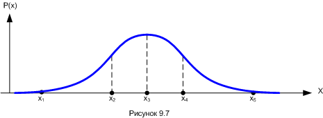 Квантовое состояние показано в виде трёхмерного графика: одна пространственная координатная ось X, и две координатных оси условного пространства квантовых векторов. Выше уже упоминалось, что квантовые вектора и их суперпозиции – групповые амплитуды вероятности – математически эквивалентны комплексным числам. Соответственно, условное пространство амплитуд вероятности показано как комплексная плоскость с координатными осями «Re» (действительная часть комплексного числа) и «Im» (мнимая часть). Так вот, в таком комбинированном ракурсе мгновенная «фотография» квантового состояния частицы в определённый момент времени (допустим, t1) выглядит как расширяющаяся, а затем сужающаяся спираль, которую вектор амплитуды вероятности описывает вокруг оси X. Вектора нарисованы для наглядности только для нескольких точек оси X, для остальных точек домыслите их самостоятельно. Если мы проследим, как ведёт себя вектор амплитуды вероятности с изменением координаты X от минус бесконечности до плюс бесконечности, то мы увидим, что он равномерно «вращается» вокруг оси X. При этом величина (длина вектора) амплитуды вероятности растёт от бесконечно малой величины, в какой-то точке достигает максимума (на рисунке это точка x3, где наибольший «диаметр» спирали), затем уменьшается обратно к бесконечно малой. Да, на всякий случай напомню, что мы тут нарисовали квантовое состояние «упрощённо», в групповых амплитудах вероятности. Полная картина квантового состояния должна была бы включать бесконечное множество разнонаправленных квантовых векторов единичной длины для каждой точки X. Но, повторяю, описание квантового состояния в амплитудах вероятности вполне достаточно для практического решения квантовых задач, поэтому таким описанием мы и будем пользоваться дальше. Эта абстрактная картинка имеет вполне конкретный физический смысл Напоминаю, что относительная (нормированная) длина вектора амплитуды вероятности определяет вероятность получить соответствующий результат при измерении. Помним, да, что вероятность равна длине вектора амплитуды вероятности, возведённой в квадрат? В нашем случае, если мы в момент времени t1 измерим координату X, то с наибольшей вероятностью получим значение, близкое к x3, там, где длина амплитуды вероятности максимальна. Менее вероятно получить значения около x2 или x4. И уж совсем маловероятно обнаружить частицу в окрестностях точек x1 или x5, где амплитуда вероятности близка к нулю. Если нарисовать соответствующий график зависимости вероятности от координаты X, то он будет выглядеть примерно так:
