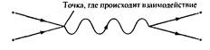 поля с точечными частицами показывает, что то же самое происходит при столкновении элементарных частиц — они отскакивают друг от друга и продолжают свой путь по новым траекториям. — однако детали этого процесса отличаются. Для большей определенности и простоты представим себе, что одна из двух частиц является электроном, а другая — ее античастицей, позитроном. При столкновении частицы и античастицы они аннигилируют с выделением энергии в чистом виде, приводящим к образованию, например, фотона9). Чтобы отличать выходящую траекторию фотона от входящих траекторий электрона и позитрона, мы будем, следуя принятому в физике соглашению, изображать ее волнистой линией. Обычно фотон проходит небольшое расстояние, после чего высвобождает энергию, полученную от первоначальной электрон-позитронной пары, путем образования другой электрон-позитронной пары, показанной в правой части рис. 6.6. Эти две частицы испытывают электромагнитное взаимодействие и, в конце концов, разлетаются по расходящимся траекториям. Такая последовательность событий имеет определенное сходство с описанием бильярдных шаров. Нас интересуют детали взаимодействия, в частности, точка, где начальные электрон и протон аннигилируют с образованием фотона. Как станет ясно далее, главным является тот факт, что время и место этого события могут быть установлены однозначно и точно, как показано на рис. 6.6. Как изменится описание, приведенное выше, если после тщательного исследования объектов, которые мы считали нульмерными точками, они окажутся одномерными струнами? Основной процесс взаимодействия будет тем же самым, но теперь движущиеся по пути к столкновению объекты представляют собой осциллирующие петли, показанные на рис. 6.7. Для определенных колебаний струны ее моды будут как раз соответствовать протону и электрону, движущихся курсом на столкновение, как показано на рис. 6.6. Истинный струнный характер становится очевидным только при исследовании в ультрамикроскопическом масштабе, выходящем далеко за пределы современных экспериментальных возможностей. Как и в случае с точечными частицами, две струны сталкиваются и аннигилируют, превращаясь во вспышку, которая представляет собой фотон и сама по себе является струной, колеблющейся в определенной моде. Таким образом, две исходные струны взаимодействуют между собой, сливаясь и образуя третью струну, как показано на рис. 6.7. Как и в случае точечных частиц, эта струна проходит некоторое расстояние, после чего выделяет энергию, полученную от двух исходных струн, разделяясь на две новые струны, которые продолжают движение. Опять же, со всех точек зрения, кроме той, которая относится к микроскопическим масштабам, это будет выглядеть идентично взаимодействию между точечными частицами на рис. 6.6. Существует, однако, радикальное различие между этими двумя описаниями. Мы подчеркнули, что взаимодействие между точечными частицами происходит в однозначно идентифицируемой точке пространства и времени, в точке, с положением которой согласятся все наблюдатели. Как мы сейчас увидим, для взаимодействия между струнами это неверно. Мы продемонстрируем это, сравнив, как Джордж и Грейс, два наблюдателя, находящихся в относительном движении, могли бы описать это взаимодействие. Мы увидим, что они не придут к единому 112 Часть III. Ко