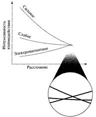 Во-первых, с чисто эстетических позиций, физики не могли примириться с тем, что природа реализовала почти все, но не все математически возможные виды симметрии. Конечно, нельзя исключать возможность того, что симметрия реализуется не полностью, но это было бы так обидно. Это было бы похоже на то, как если бы Бах, написав многоголосные переплетающиеся партии, встроенные в гениальную картину музыкальной симметрии, забыл про финал, расставляющий все по своим местам. Во-вторых, даже в стандартной модели, в теории, которая игнорирует гравитацию, многочисленные технические трудности, связанные с квантовыми эффектами, безболезненно разрешаются при использовании суперсимметрии. Основная проблема состоит в том, что каждый отдельный вид частиц вносит свой собственный вклад в микроскопический квантовый хаос. Исследуя глубины этого хаоса, физики обнаружили, что некоторые процессы, связанные со взаимодействием частиц, можно описать непротиворечивым образом только при очень Глава 7. «Супер» в суперструнах 121 точной настройке параметров стандартной модели, с точностью, превышающей 10--15, для нейтрализации наиболее разрушительных квантовых эффектов. Для сравнения: такая точность необходима для того, чтобы пуля, выпущенная из воображаемого сверхмощного ружья, попала в цель на Луне с отклонением, не превышающим размеры амебы. Хотя стандартная модель допускает регулировку параметров с такой точностью, многие физики испытывают сильное недоверие к теории, которая устроена настолько деликатно, что разваливается, если параметр, от которого она зависит, изменяется на единицу в пятнадцатом разряде после запятой5'. Суперсимметрия радикальным образом изменяет эту ситуацию, поскольку бозоны — частицы, имеющие целочисленный спин (получившие свое название в честь индийского физика Сатьендры Бозе), и фермионы — частицы, спин которых равен половине целого (нечетного) числа (названные в честь итальянского физика Энрико Ферми), имеют тенденцию вносить такие вклады в квантовый хаос, которые взаимно сокращаются. Вклады как будто находятся на противоположных концах коромысла: когда вклад бозонов в квантовые флуктуации положителен, вклад фермионов отрицателен, и наоборот. Поскольку суперсимметрия гарантирует, что бозоны и ферм ионы существуют парами, происходит изначальное сокращение, которое существенно уменьшает самые интенсивные квантовые флуктуации. В результате непротиворечивость суперсимметричной стандартной модели, в которую включены все частицы-суперпартнеры, перестает зависеть от подозрительно тонкой регулировки значений параметров обычной стандартной модели. Хотя этот момент кажется сугубо техническим, он делает суперсимметрию очень привлекательной в глазах многих специалистов по физике элементарных частиц. Третье косвенное доказательство в пользу суперсимметрии связано с понятием великого объединения. Одно из самых загадочных свойств четырех фундаментальных взаимодействий природы состоит в огромных различиях интенсивности этих взаимодействий. Интенсивность электромагнитных сил не превышает одного процента от интенсивности сильного взаимодействия. Слабое взаимодействие примерно в тысячу раз слабее электромагнитного, а интенсивность гравитационных сил слабее еще в несколько сотен миллионов миллиардов миллиардов 