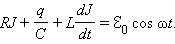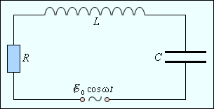 Процессы, возникающие в электрических цепях под действием внешнего периодического источника тока, называются вынужденными колебаниями. Вынужденные колебания, в отличие от собственных колебаний в электрических цепях, являются незатухающими. Периодический внешний источник обеспечивает приток энергии к системе и не дает колебаниям затухать, несмотря на наличие неизбежных потерь. Особый интерес представляет случай, когда внешний источник, напряжение которого изменяется по гармоническому закону с частотой ω, включен в электрическую цепь, способную совершать собственные свободные колебания на некоторой частоте ω0. Если частота ω0 свободных колебаний определяется параметрами электрической цепи, то установившиеся вынужденные колебания всегда происходят на частоте ω внешнего источника. Для установления стационарных вынужденных колебаний необходимо некоторое время Δt после включения в цепь внешнего источника. Это время по порядку величины равно времени τ затухания свободных колебаний в цепи. Электрические цепи, в которых происходят установившиеся вынужденные колебания под действием периодического источника тока, называются цепями переменного тока. Рассмотрим последовательный колебательный контур, то есть RLC-цепь, в которую включен источник тока, напряжение которого изменяется по периодическому закону (рис. 5.3.1):