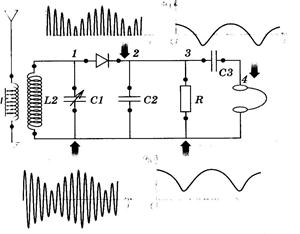 6. Детекторный радиоприёмник состоит из приёмной антенны, индуктивно связанного с ней колебательного контура, детектора (высокочастотный полупроводниковый диод) конденсатора, исполняющего роль фильтра и наушников. В антенне возбуждаются модулированные высокочастотные колебания. При резонансе такие же колебания возникают в колебательном контуре. Детектор осуществляет детектирование – выделение низкочастотных звуковых колебаний из модулированных колебаний высокой частоты. Сначала происходит выпрямление, а затем выделение низкочастотной огибающей высокочастотных импульсов.