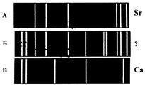 1(А) Какого цвета мы видим абсолютно черное тело? 1) черного 2) бордово-черного 3) фиолетово-черного 4) любого цвета в зависимости от температуры 2(А) Из перечисленных ниже факторов выберите те, от которых зависит кинетическая энергия электронов, вылетевших с поверхности металлической пластины при ее освещении светом лампы. А. Интенсивность падающего света Б. Частота падающего света В. Работа выхода электрона из металла 1)только А 3) Б и В 2)только Б 4) А, Б, В 3(А) Металлическую пластину освещали монохроматическим светом одинаковой интенсивности: сначала красным, потом зеленым, затем синим. В каком случае максимальная кинетическая энергия вылетающих фотоэлектронов была наибольшей? 1) при освещении красным светом 2) при освещении зеленым светом 3) при освещении синим светом 4) во всех случаях одинакова 4(А) В опытах по фотоэффекту взяли пластину из металла с работой выхода 3,4·10-19 Дж и стали освещать ее светом частоты 6·1014 Гц. Затем частоту уменьшили в 2 раза, одновременно увеличив в 1,5 раза число фотонов, падающих на пластину за 1 с. В результате этого число фотоэлектронов, покидающих пластину за 1 с, 1) увеличилось в 1,5 раза 2) стало равным нулю 3) уменьшилось в 2 раза 4) уменьшилось более чем в 2 раза 5(А) На рисунках А, Б, В приведены спектры излучения паров стронция, неизвестного образца и кальция. Можно утверждать, что в образце…