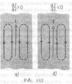 и очень быстро останавливается. Это объясняется тем, что возникшие токи Фуко имеют такое направление, что действующие на них со стороны магнитного поля силы тормозят движение маятника. Этот факт используется для успокоения (демпфирования) подвижных частей различных приборов. Если в описанном маятнике сделать радиальные вырезы, то вихревые токи ослабляются и торможение почти отсутствует. Вихревые токи помимо торможения (как правило, нежелательного эффекта) вызывают нагревание проводников. Поэтому для уменьшения потерь на нагревание якоря генераторов и сердечники трансформаторов делают не сплошными, а изготовляют из тонких пластин, отделенных одна от другой слоями изолятора, и устанавливают их так, чтобы вихревые токи были направлены поперек пластин. Джоулева теплота, выделяемая токами Фуко, используется в индукционных металлургических печах. Индукционная печь представляет собой тигель, помещаемый внутрь катушки, в которой пропускается ток высокой частоты. В металле возникают интенсивные вихревые токи, способные разогреть его до плавления. Такой способ позволяет плавить металлы в вакууме, в результате чего получаются сверхчистые материалы. Вихревые токи возникают и в проводах, по которым течет переменный ток. Направление этих токов можно определить по правилу Ленца. На рис. 182, а показано направление вихревых токов при возрастании первичного тока в проводнике, а на